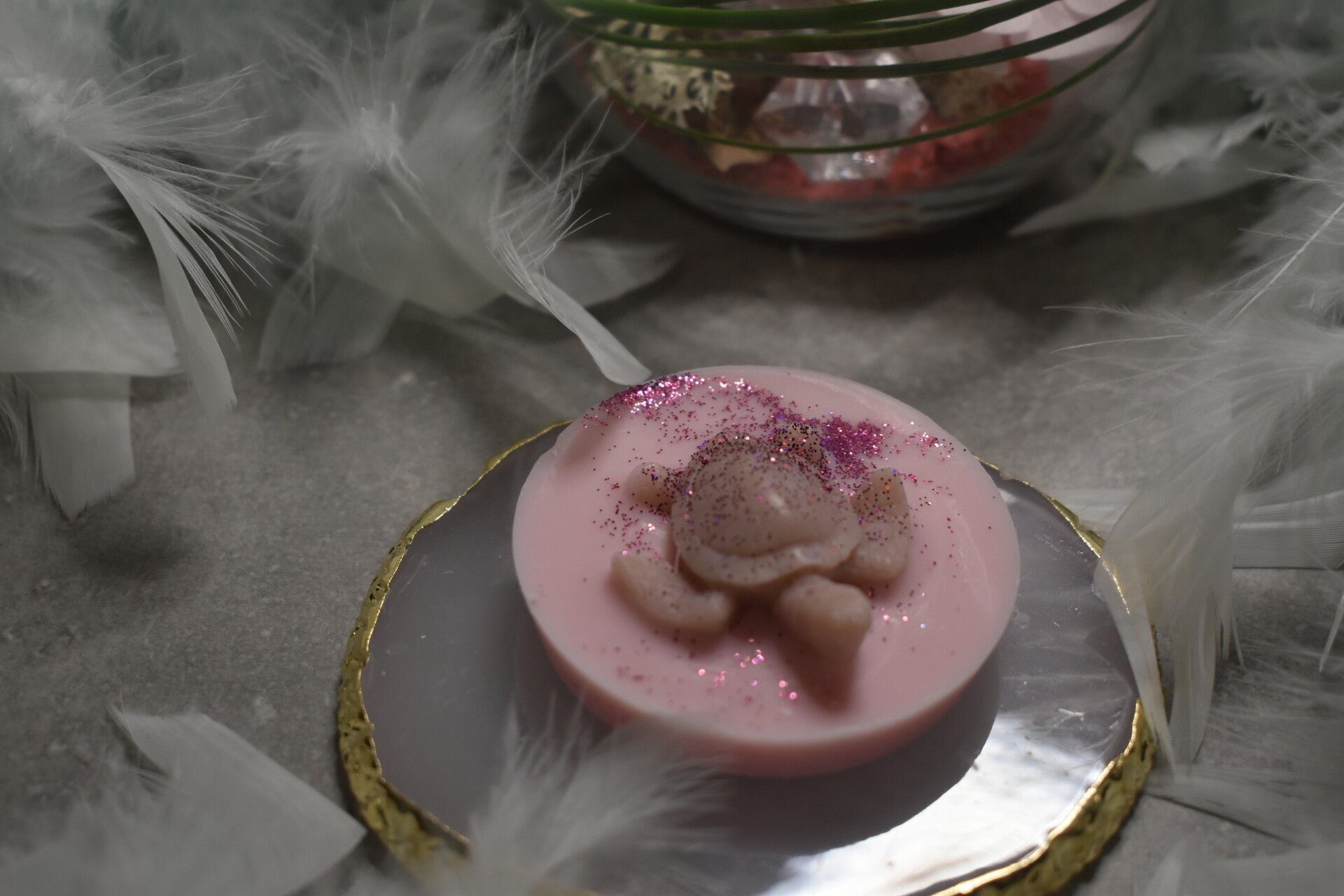 Ingrédients : Cire de soja et d'olive biodégradable ; Parfum de Grasse ; Mica.